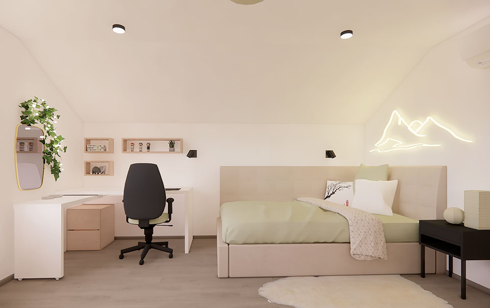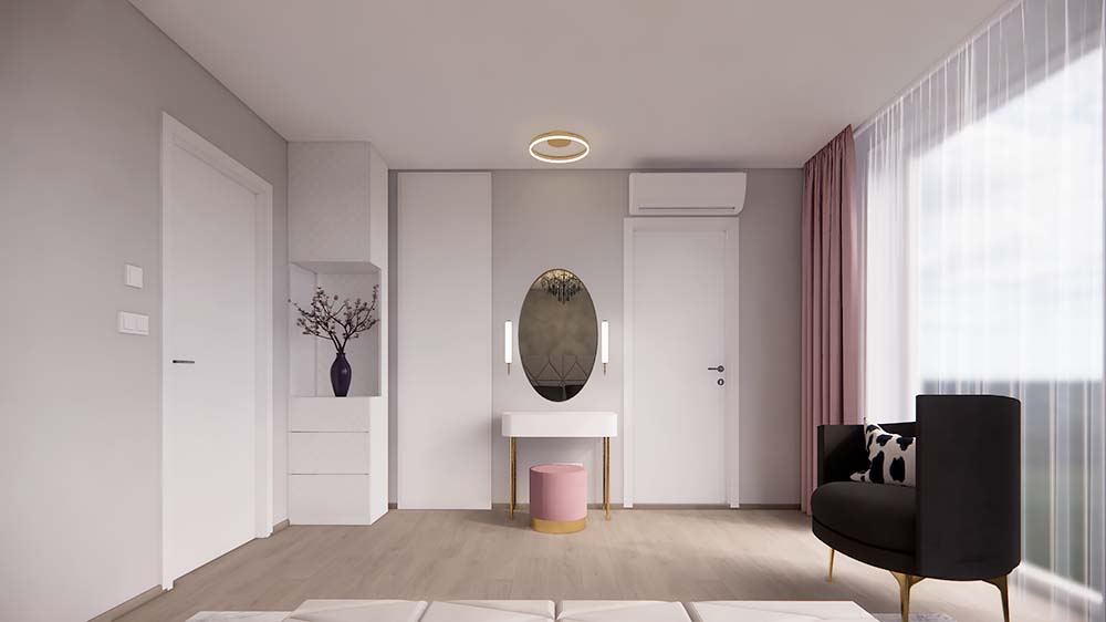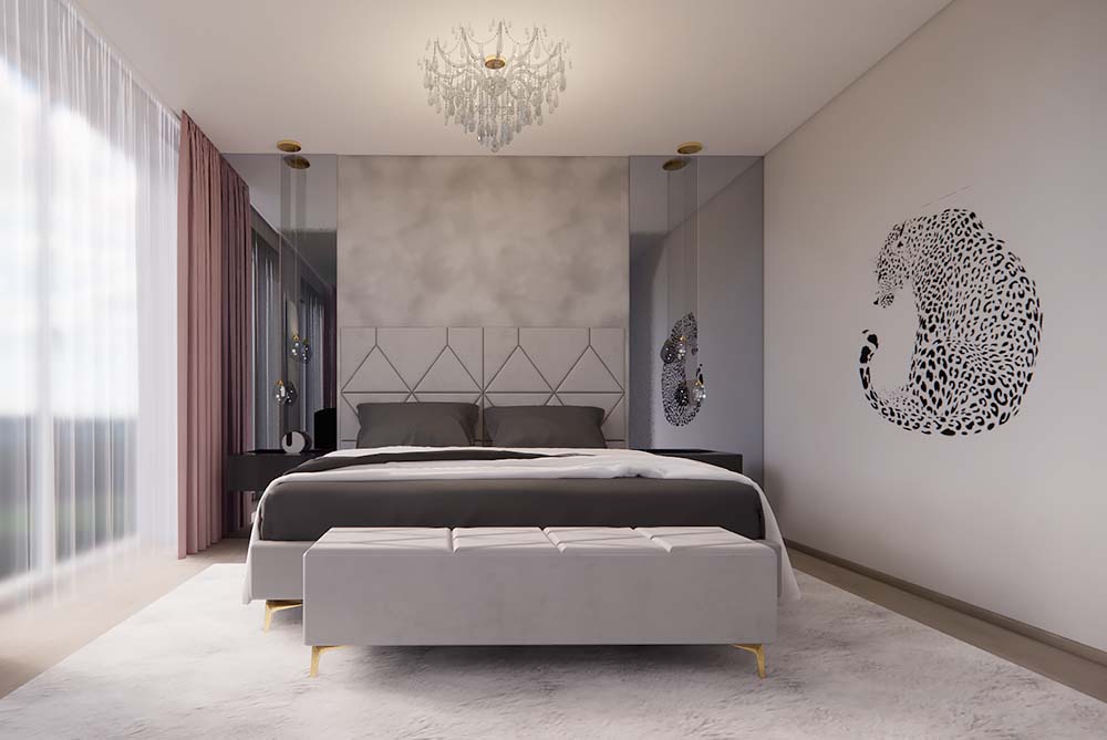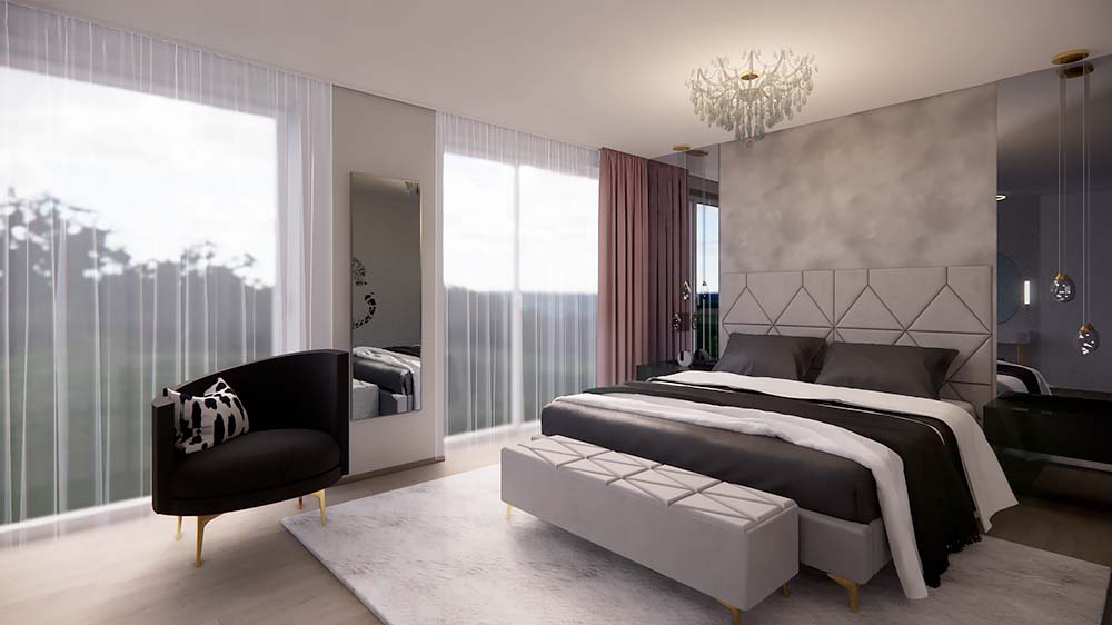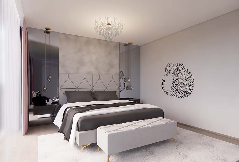 Ložnice je vybavena velkými zrcadly, která opticky zvětšují prostor a dodávají místnosti vzdušnost. Dětské pokoje jsou navrženy podle vkusu dětí, ale zároveň harmonicky ladí s ostatními prvky domu, aby celkový bytový návrh působil jednotně a stylově. Návrh obývacího pokoje je promyšlený, s důrazem na pohodlí a estetický dojem, který reflektuje glamour styl. Celkový design interiéru kombinuje eleganci s praktičností a je příkladem toho, jak může bytový návrhář vytvořit domov, který působí luxusně, a přesto je funkční.