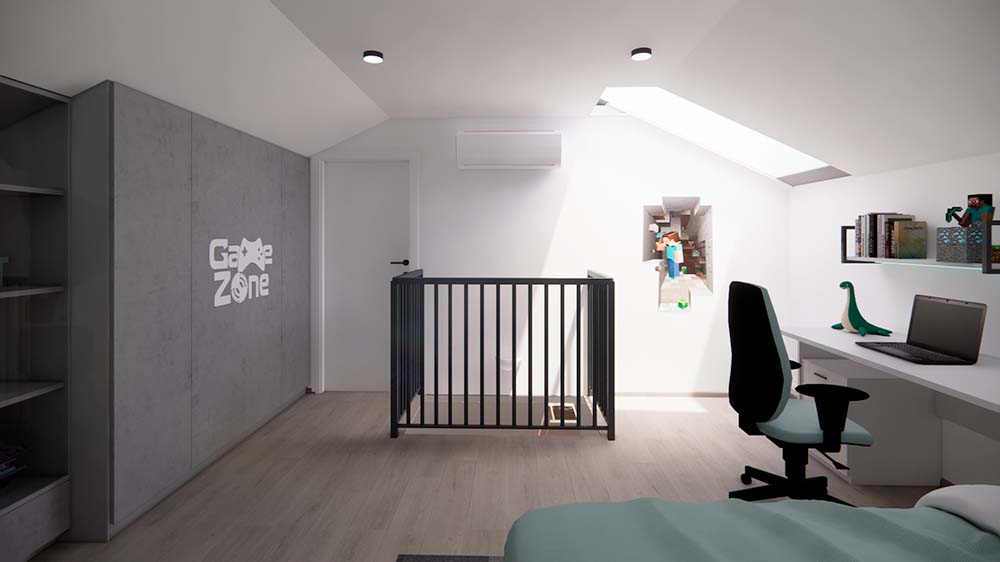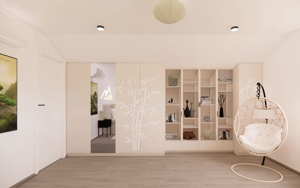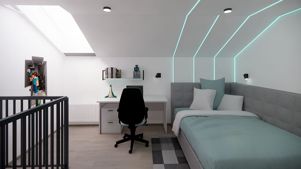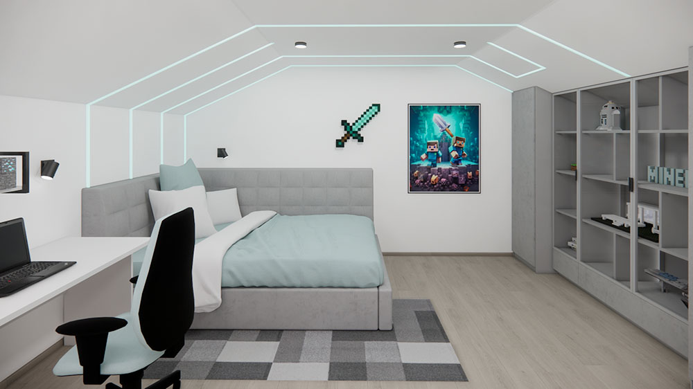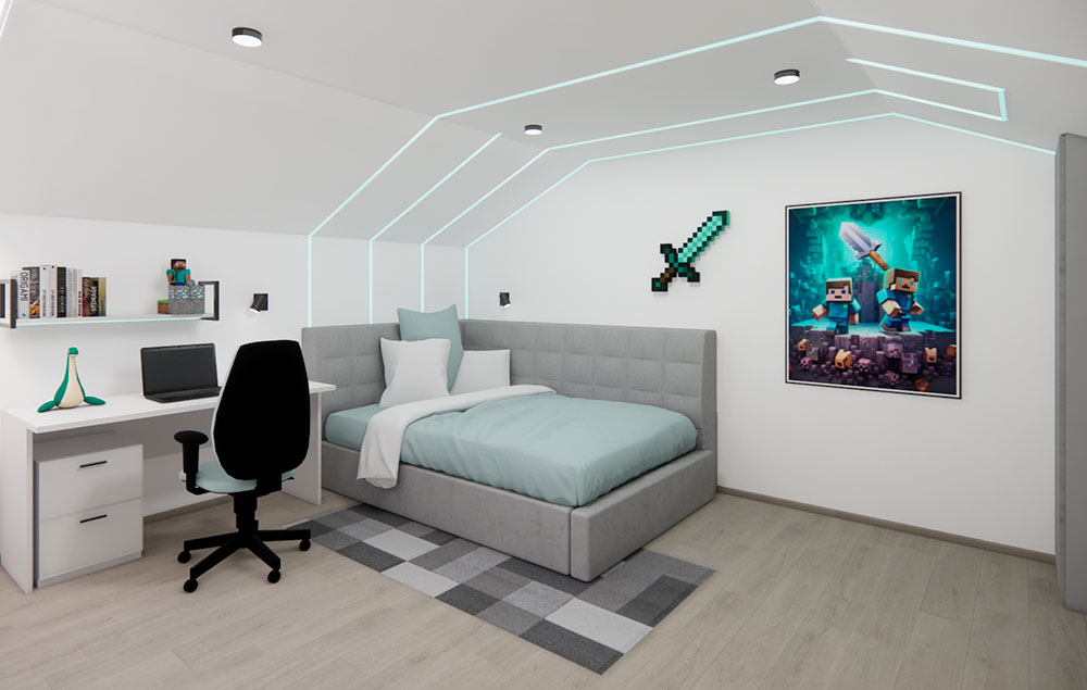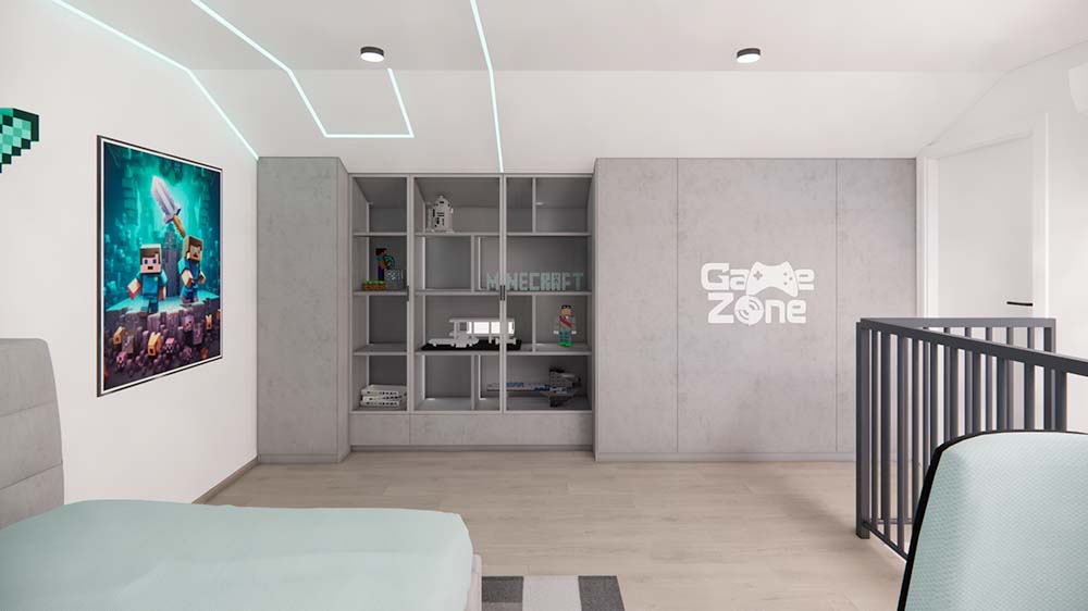 Ložnice je vybavena velkými zrcadly, která opticky zvětšují prostor a dodávají místnosti vzdušnost. Dětské pokoje jsou navrženy podle vkusu dětí, ale zároveň harmonicky ladí s ostatními prvky domu, aby celkový bytový návrh působil jednotně a stylově. Návrh obývacího pokoje je promyšlený, s důrazem na pohodlí a estetický dojem, který reflektuje glamour styl. Celkový design interiéru kombinuje eleganci s praktičností a je příkladem toho, jak může bytový návrhář vytvořit domov, který působí luxusně, a přesto je funkční.