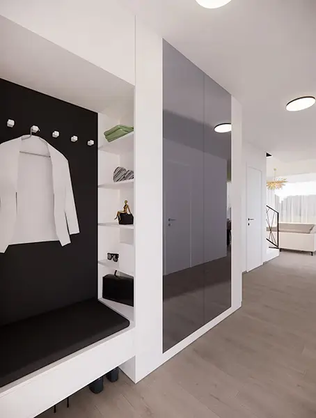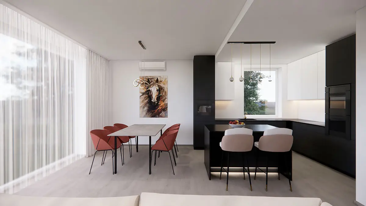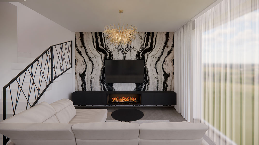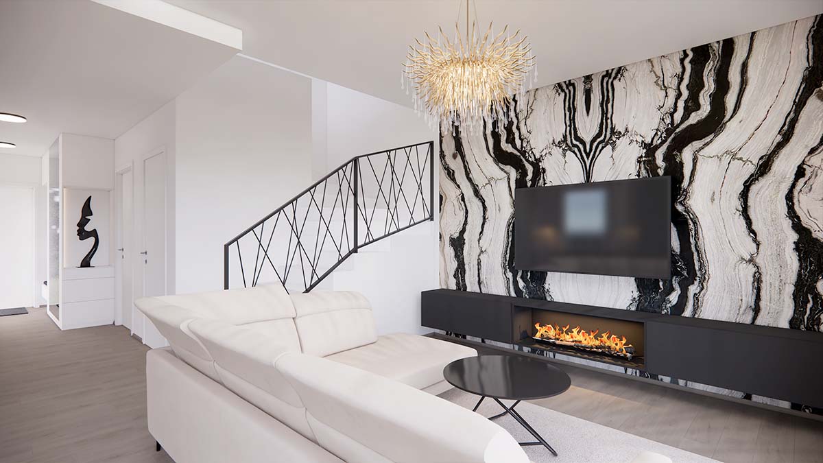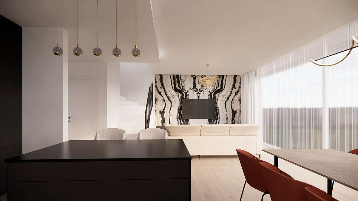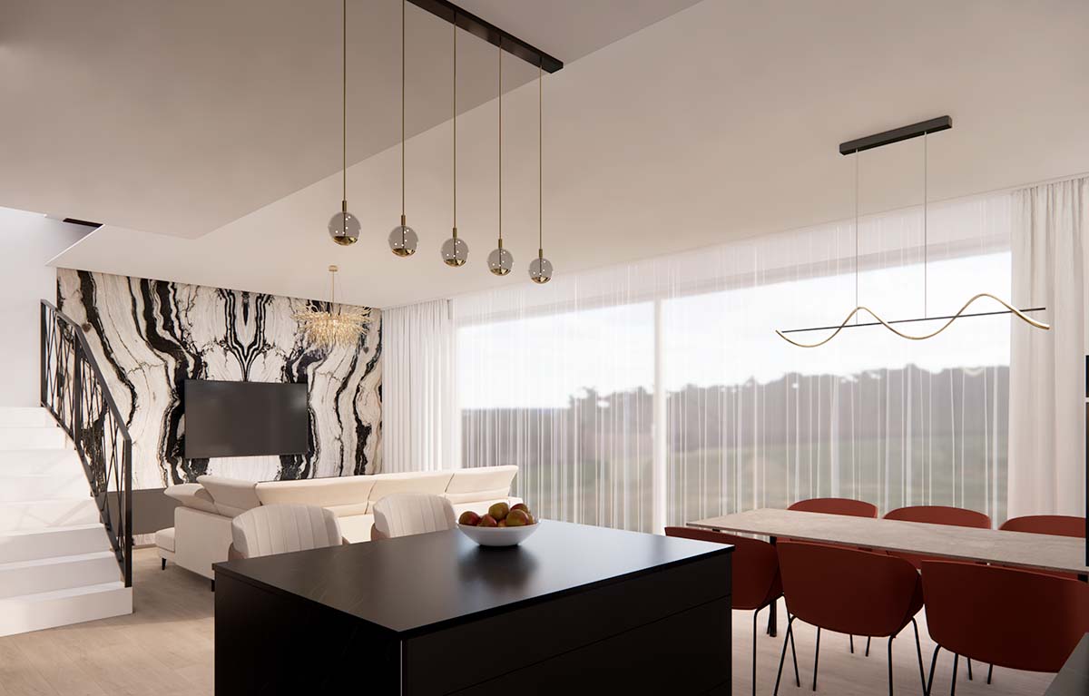Návrh interiéru rodinného domu ve stylu glamour je ukázkou elegance a luxusu s důrazem na harmonii a praktičnost. V hlavním prostoru se nachází velkolepá mramorová zeď, která tvoří dominantní prvek interiéru. Křišťálový lustr zavěšený v obývacím pokoji dodává prostoru nádech sofistikovanosti a umocňuje dojem z celého designu. Kombinace černé a bílé vytváří moderní kontrast, který se odráží i v černé kuchyni, kde se setkává elegance s funkčností. Tento návrh interiéru je dílem zkušené bytové architektky, která klade důraz nejen na estetiku, ale také na praktičnost v každodenním životě.
