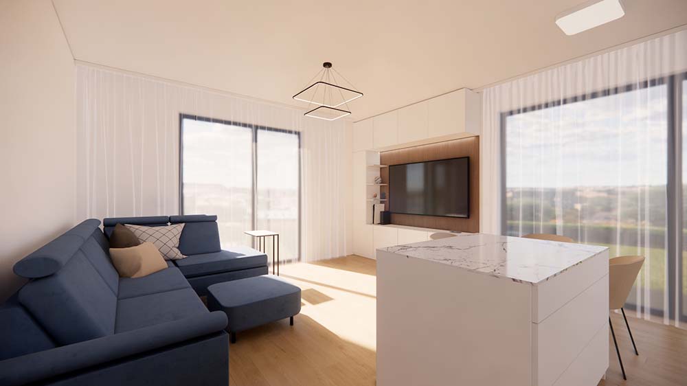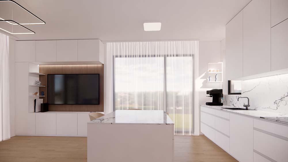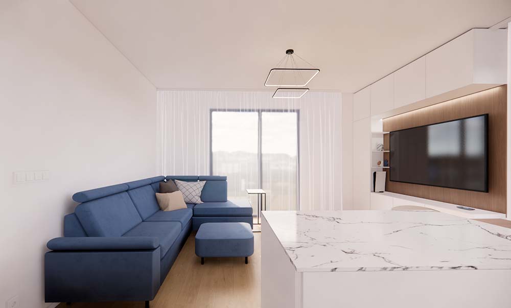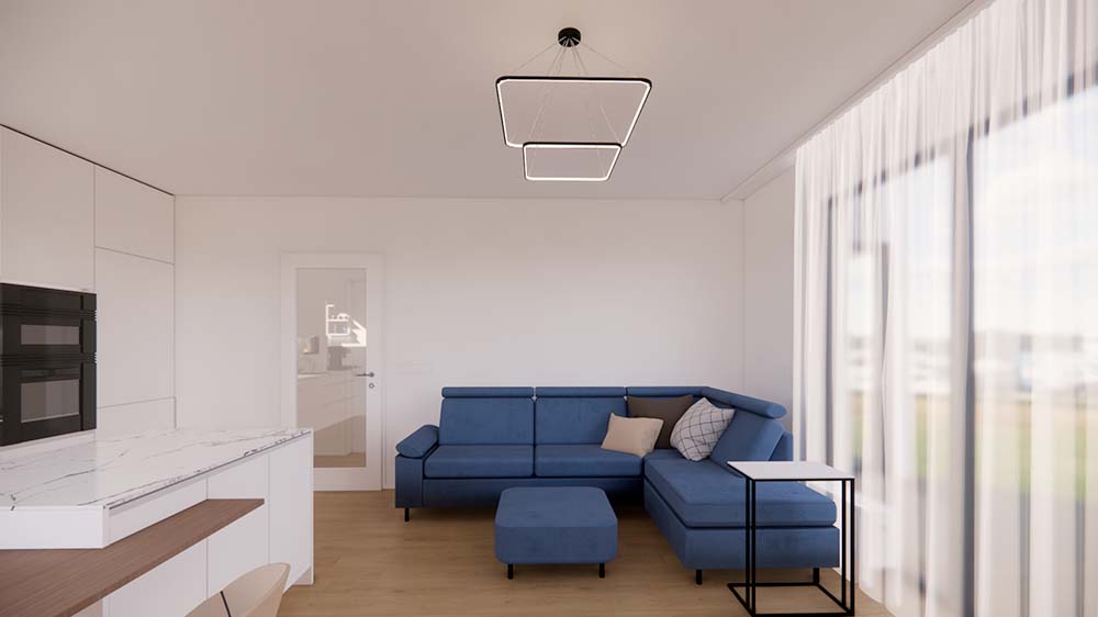 Obývací pokoj s velkými okny zalitými světlem je srdcem domova. Pohodlná tmavě modrá pohovka vytváří příjemný kontrast s jemnými béžovými a bílými tóny celého prostoru. Minimalistický nábytek na míru a vzdušné závěsy dodávají prostoru lehkost a přirozenost. Každý detail tu má své místo – od subtilního stropního osvětlení po promyšlené úložné prostory kolem televize.