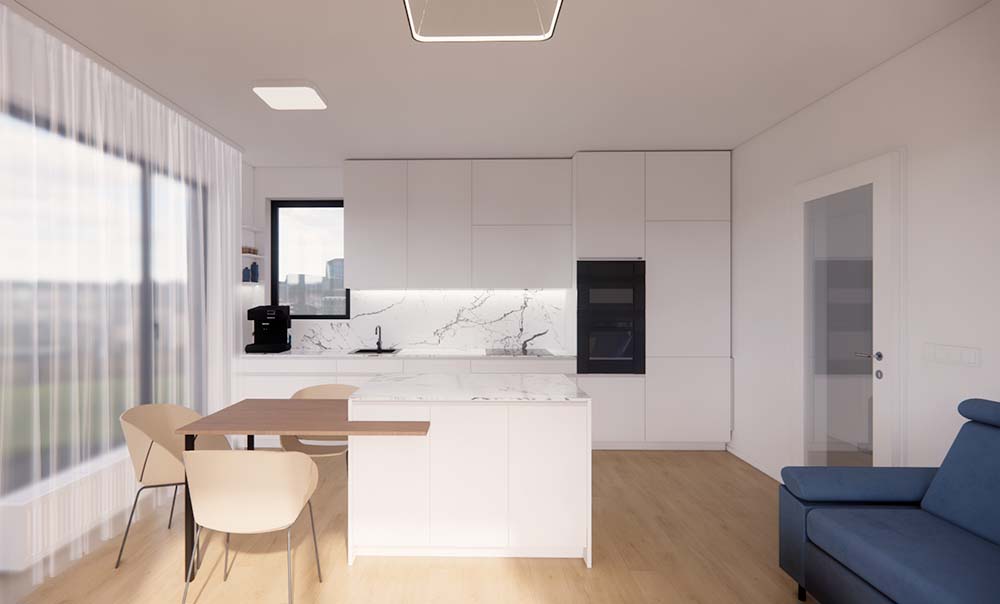 Kuchyně, propojená s jídelním koutem, působí elegantně a prakticky zároveň. Mramorová pracovní deska dodává prostoru šmrnc a propojuje bílou linku s jemným dekorem dřeva. Malý jídelní stůl navazuje na ostrůvek a vytváří přirozený prostor pro společné chvíle.