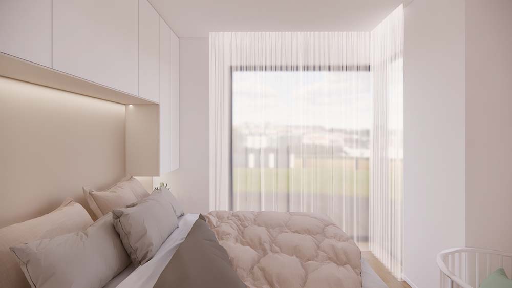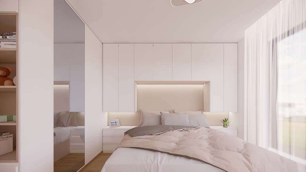Ložnice je klidným útočištěm. Jemné textilie, integrované skříně a hřejivé světlo vytvářejí ideální prostředí pro odpočinek. Zrcadlové plochy prostor opticky zvětšují, zatímco otevřené police působí osobně a útulně.