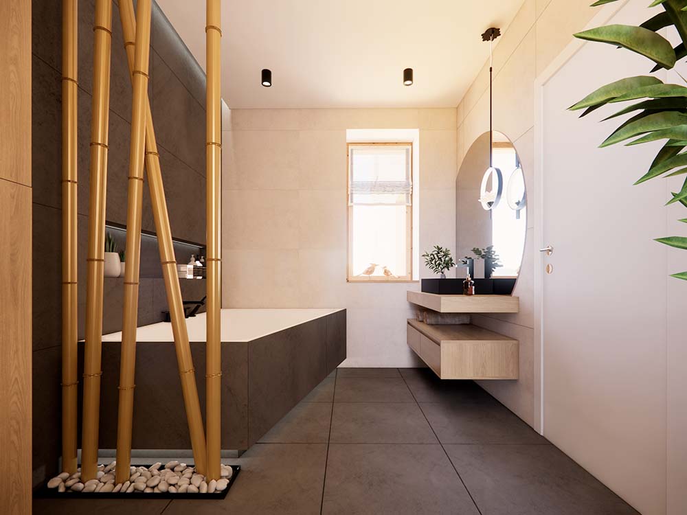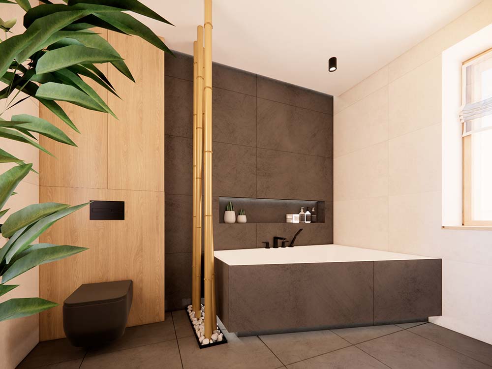 • Natural elements: bamboo decorations and pebbles around the bathtub promote a relaxing atmosphere.