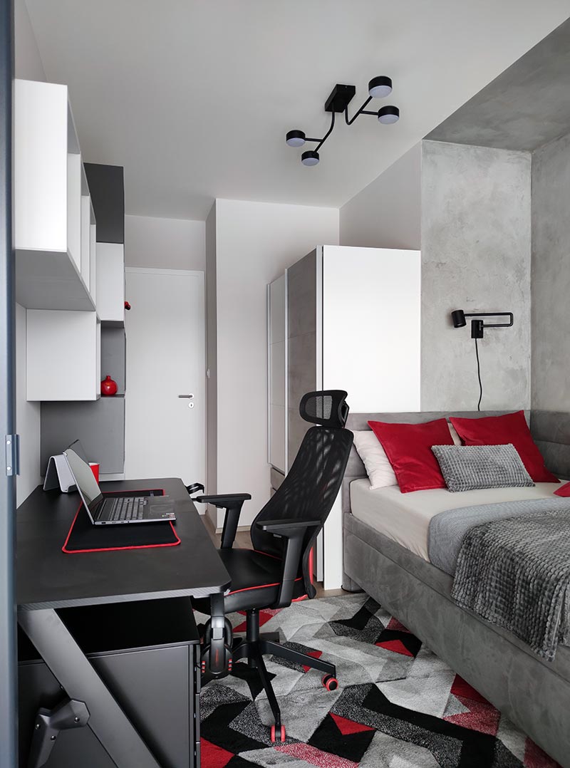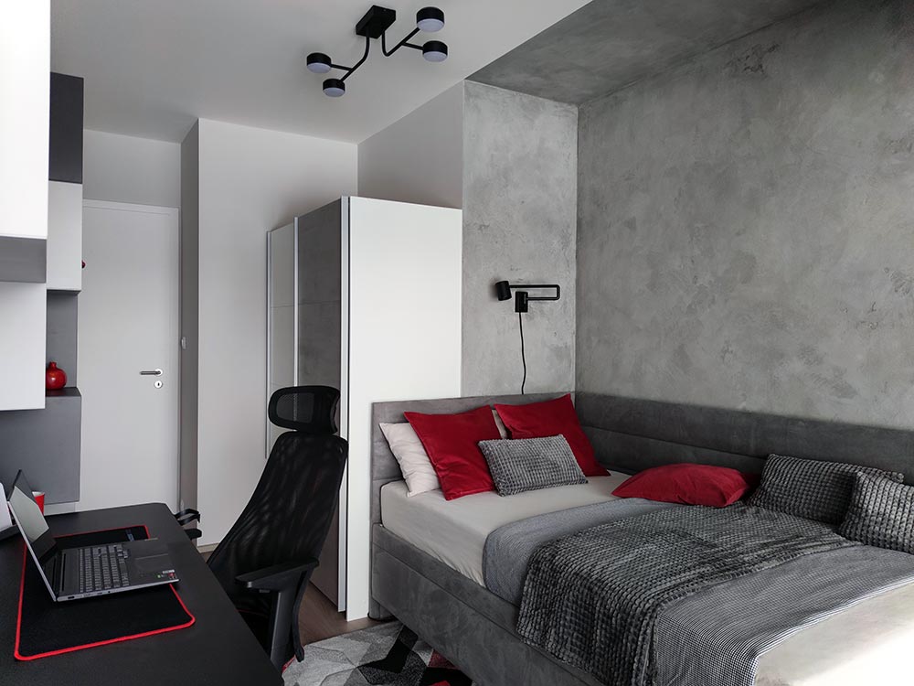 The design of a student room with a concrete wall brings a modern and industrial look that can be easily adapted to individual needs and tastes.