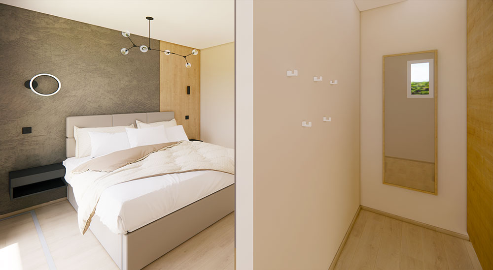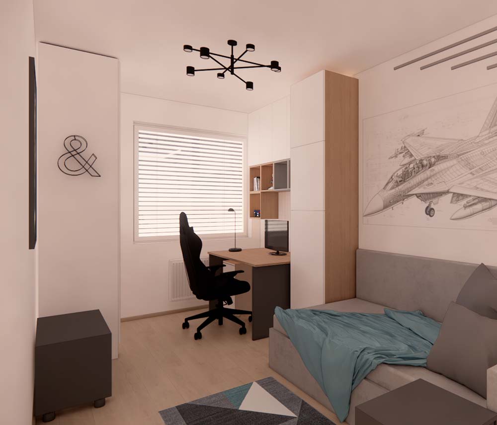 The main requirement of the owners of this new building was a functional and modern interior in light and neutral colours with few bright accents. Another condition was to leave the electrical outlets in place to avoid major structural modifications. In order to make the most of the space and meet all the needs of these clients, we designed several bespoke wardrobes. On the other hand, for the student room, which is likely to change in a few years and is not worth investing a lot in, we have chosen piece furniture. In the home office, which also serves as a room for occasional overnight guests, we put everything you need to work and relax, including a sofa bed and acoustic panels.
