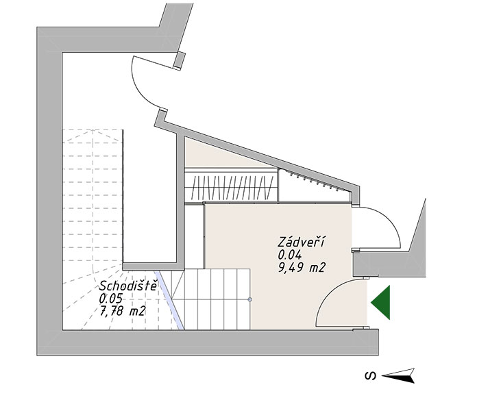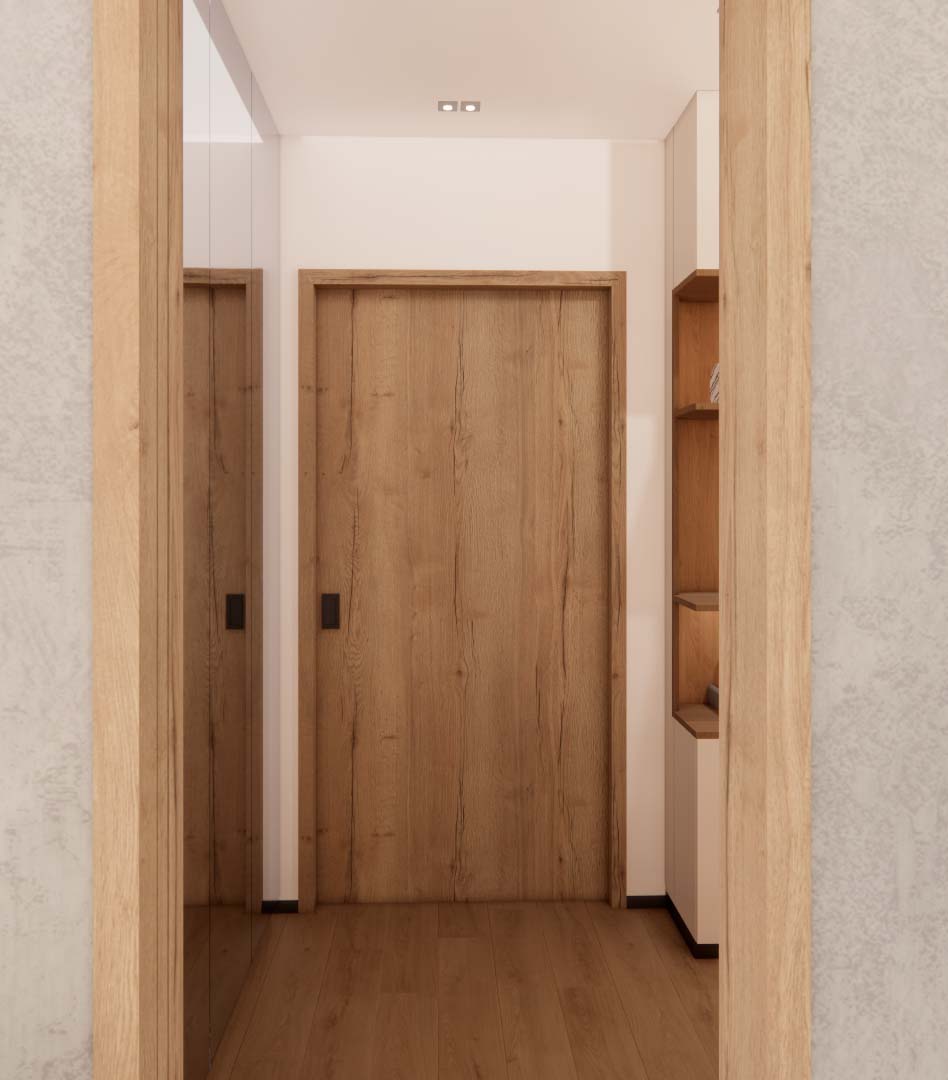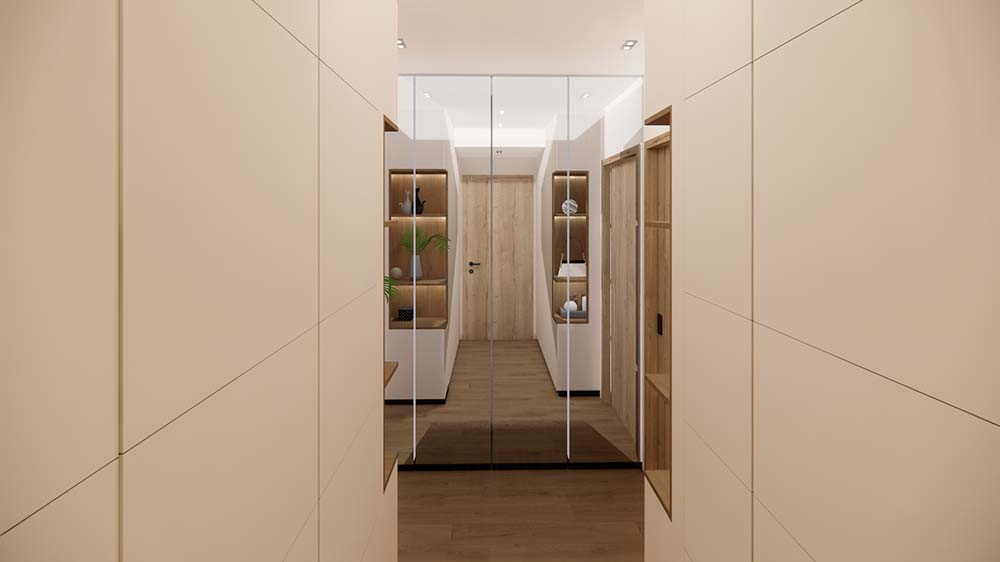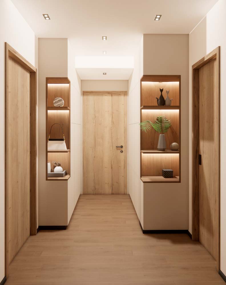 The hallway, designed in a minimalist style, has plenty of storage space.