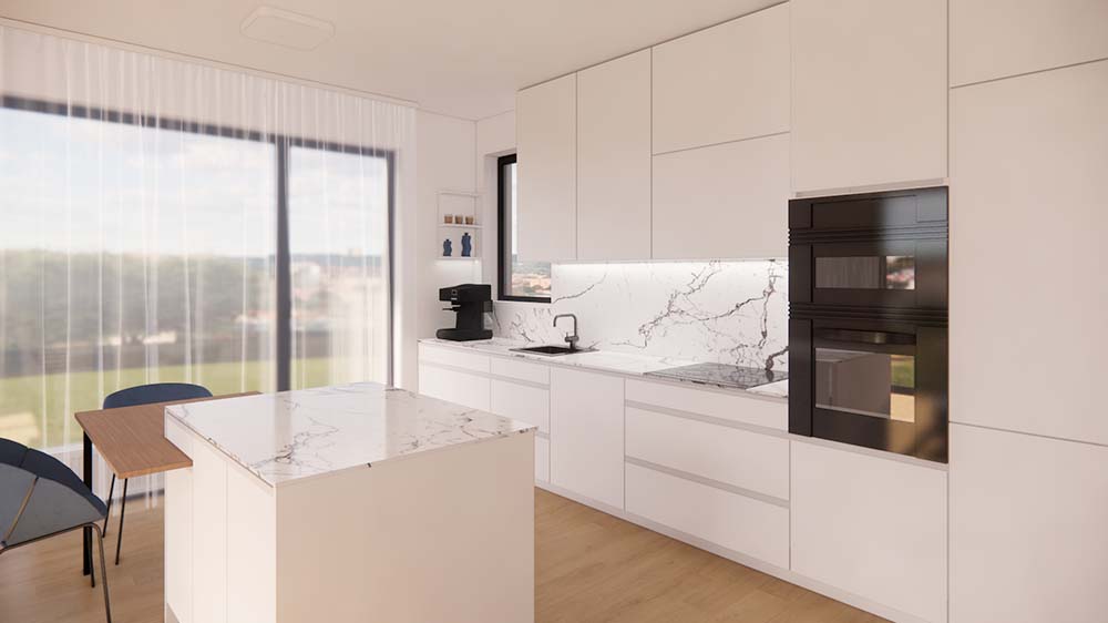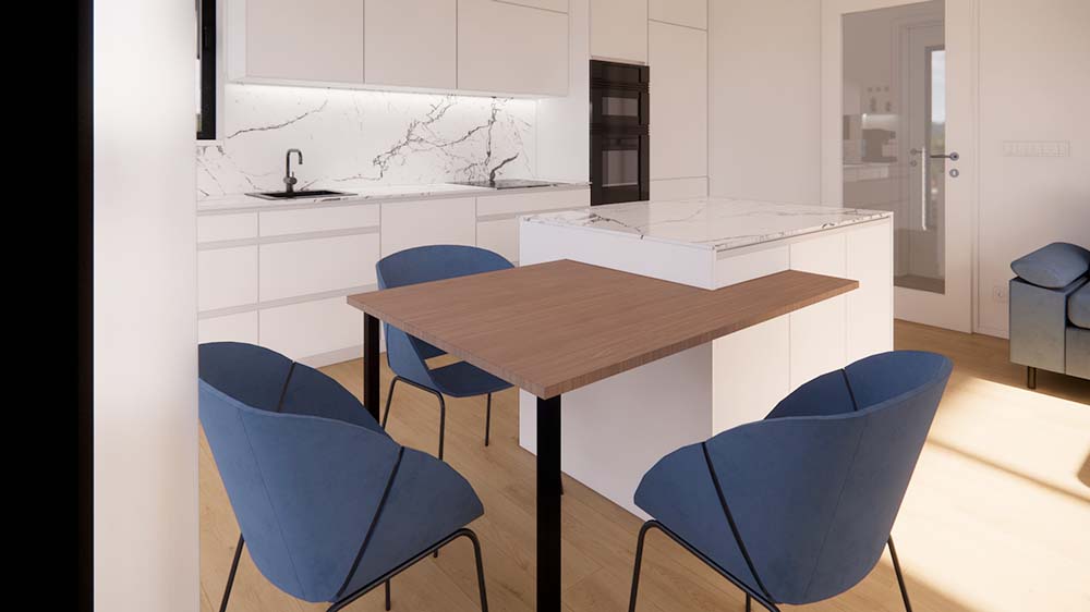 Návrh bílé kuchyně s mramorovou deskou