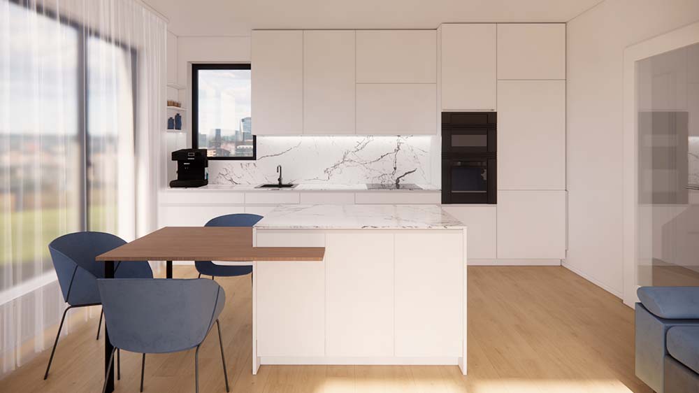 Interiérový designér zde vytvořil harmonické spojení bílé kuchyně, mramorové pracovní desky a dřevěné podlahy, čímž vznikl nadčasový a světlý interiér. Kuchyňská linka s integrovanými úchyty a množstvím úložných prostor působí elegantně a neruší celkový vzhled místnosti.