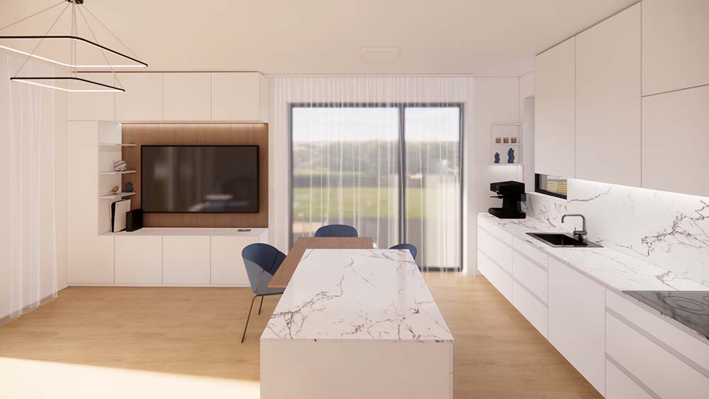 Otevřený koncept propojuje kuchyň s obývacím pokojem, kde na návrh kuchyní plynule navazuje minimalistická TV stěna s dřevěným obložením. Návrh interiéru počítá i s jemným ambientním osvětlením, které dodává prostoru útulnost.