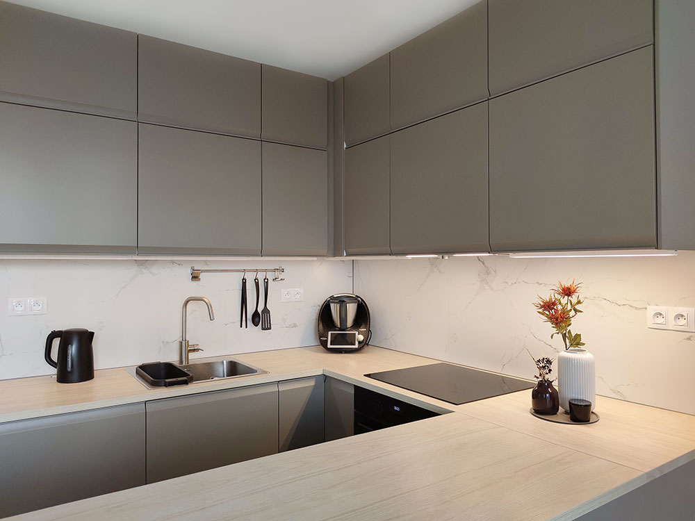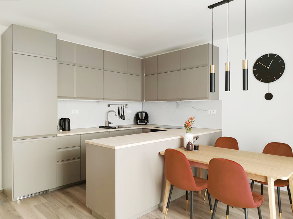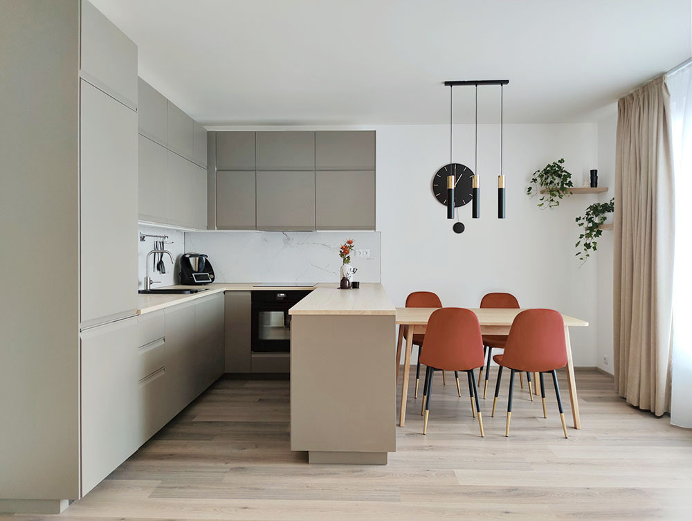 Tento interiér kuchyně je navržen v moderním minimalistickém stylu s důrazem na čisté linie a funkčnost. Dominantní barevné schéma kombinuje teplé taupe odstíny na kuchyňské lince a skříňkách s přírodními tóny světlého dřeva na pracovní desce a jídelním stole. Kuchyň je ergonomicky uspořádána do tvaru „L“ s ostrůvkem, který slouží jako pracovní i servírovací plocha.