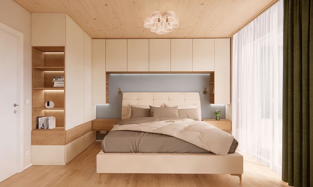 Vestavěný nábytek po obou stranách lůžka jemně rámuje postel a vytváří dojem, že vše má své místo. Dřevěný strop a podlaha navozují pocit blízkosti přírodě, zatímco závěsy v hluboké zelené barvě tlumí světlo a vytvářejí pocit soukromí. Tento návrh ložnice je ukázkou toho, jak může bytový architekt přinést do domova nejen krásu, ale i vřelost. Pokud hledáte světlou ložnici inspirace, možná právě zde najdete nápovědu, jak vytvořit prostor, kde se bude dobře žít.