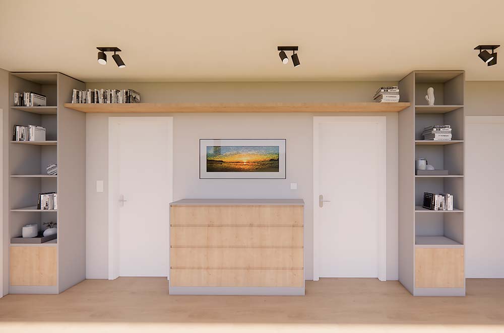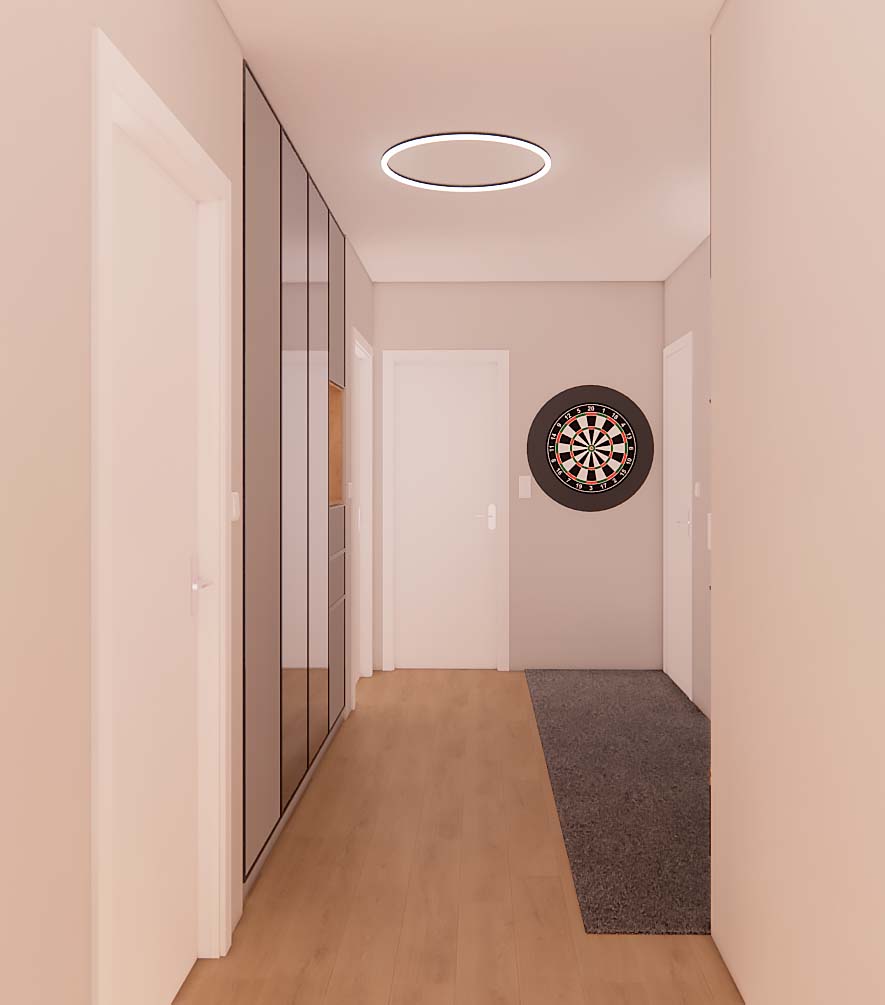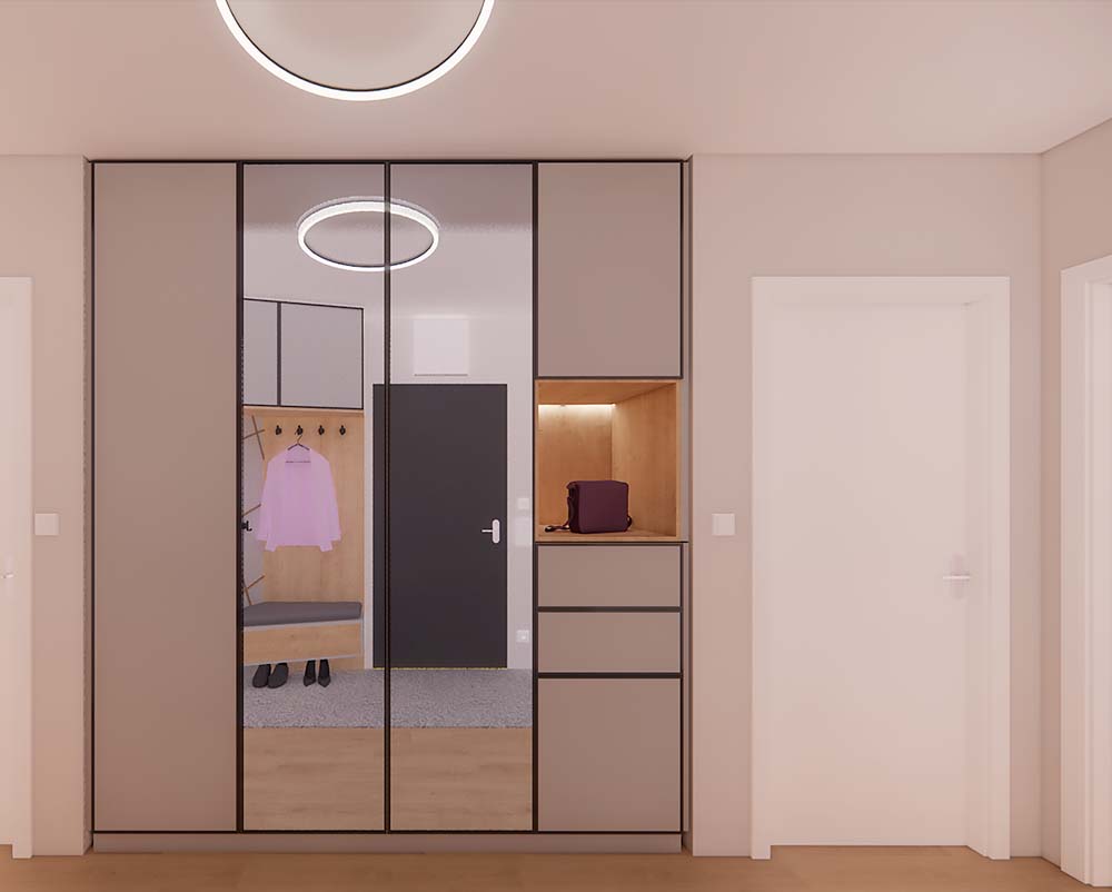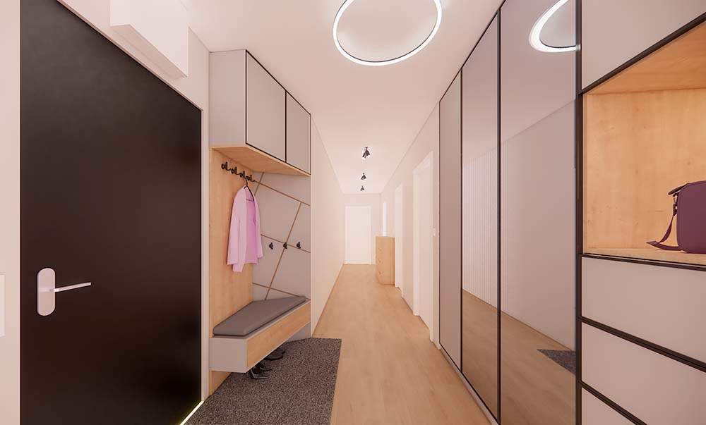 Дизайнер интерьеров из Праги создал дизайн прихожей, сочетающий в себе элегантность и функциональность. В прихожей доминирует изготовленная на заказ стенка, которая предоставляет достаточно места для хранения, сохраняя при этом минималистичный вид помещения. Большой шкаф предназначен для хранения сезонной одежды и обуви для всей семьи, что помогает поддерживать порядок в прихожей. В прихожей также был спроектирован практичный книжный шкаф, который предлагает не только место для хранения книг, но и является отличительным элементом, придающим пространству характер. Этот продуманный дизайн прихожей позволяет максимально использовать каждый сантиметр, создавая гостеприимный вход в дом, который соответствует современным тенденциям дизайна интерьера.