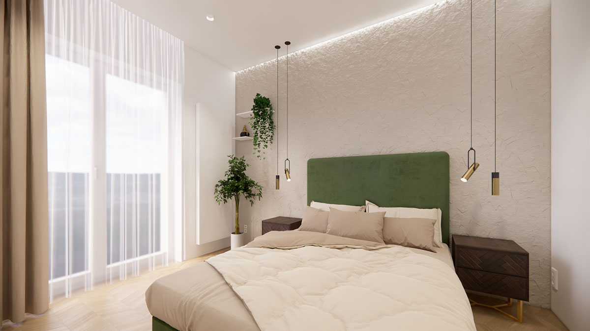 Дизайн интерьера спальни Vinohradská сочетает в себе современную элегантность и максимальный комфорт.